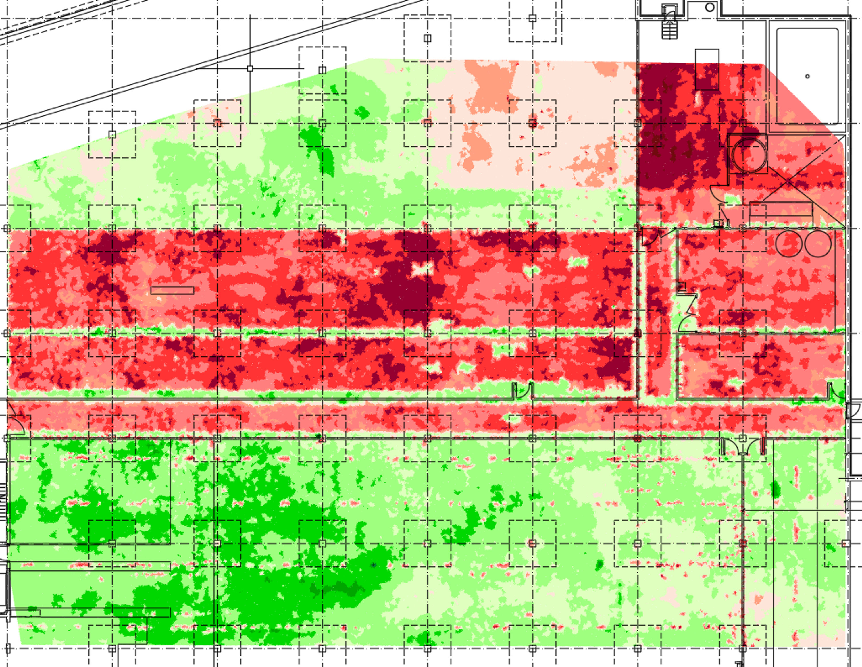 Die Lagerhalle wurde im EG und im UG mit einem terrestrischen Laserscanner vermessen. Mit den Scanaufnahmen konnte die Stärke der Decke und die Ebenheit im EG auf der gesamten Fläche von ca. 2000m² ermittelt werden. Die daraus resultierenden Pläne wurden farblich nach stärke der Decke dargestellt. Anhand dieser Daten kann die Tragfähigkeit beurteilt werden.