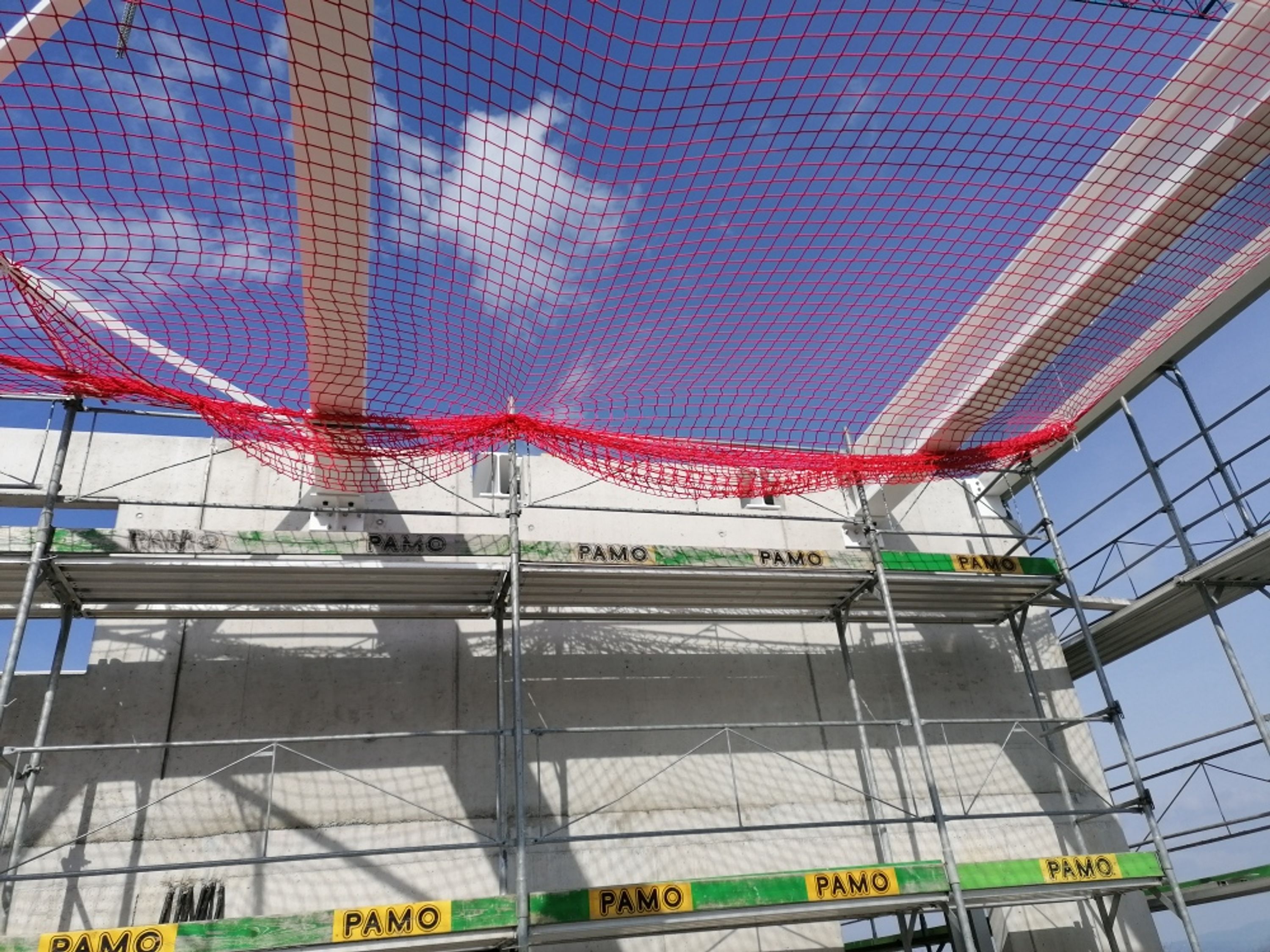 Das komplette Dach wurde als Stahlbau, bestehend aus Hauptträgern (HEA550) und Nebenträgern (IPE180) ausgeführt. Die Dachhaut bildet abschliessend ein Trapezblech. Somit konnte eine lang gespannte Hallendecke mit Stahlträgern realisiert werden. Es liegt eine optimal genutzte Bauaufteilung zwischen Stahl- und Betonbauteilen vor.