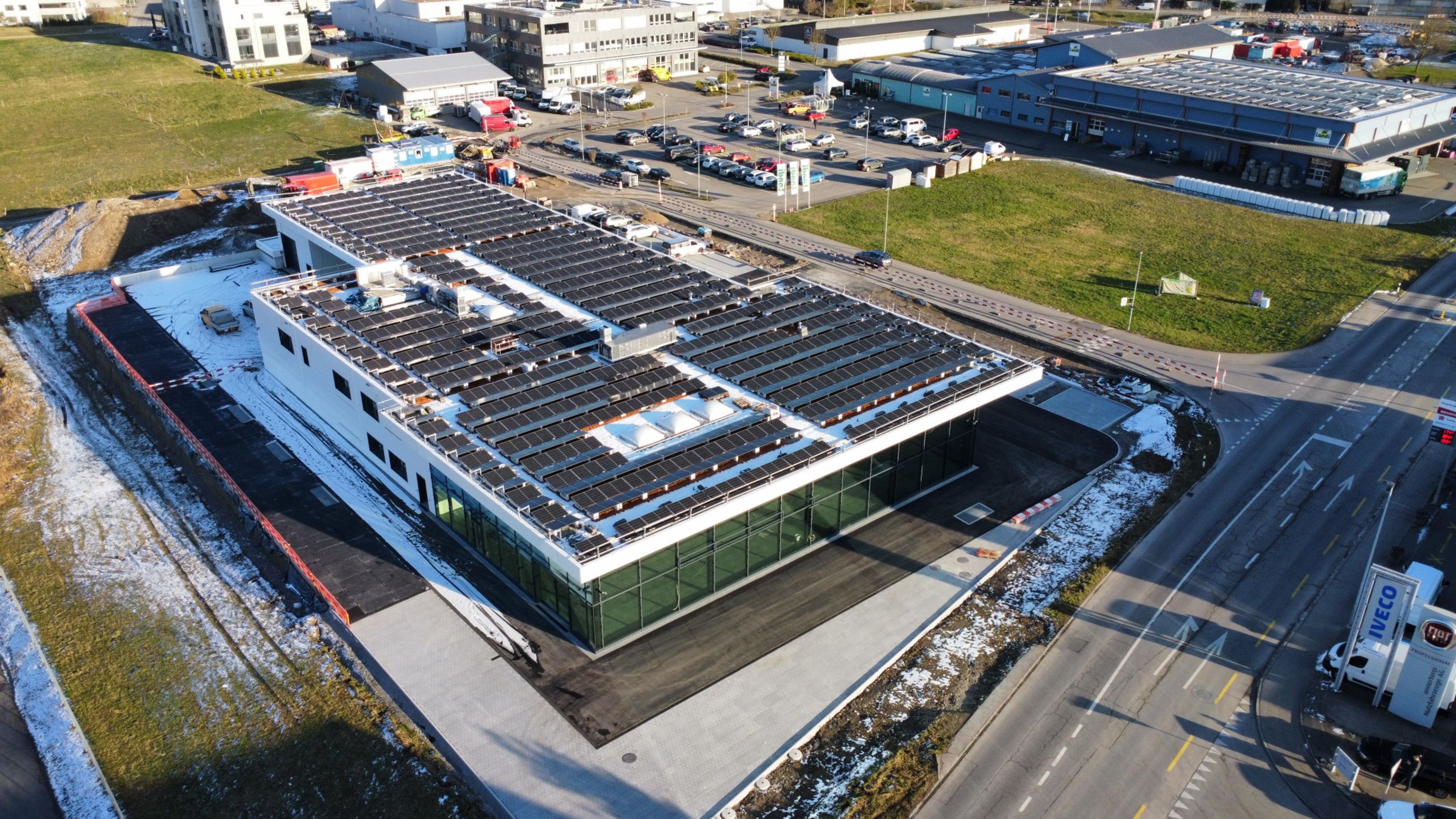 Im Erdgeschoss befinden sich neben der Ausstellfläche auch die Werkstatt und die aussen liegende Waschstrasse. Das Zwischengeschoss bietet Platz für die Büroräumlichkeiten der Geschäftsleitung und der Mitarbeitenden, sowie Lager- und Archivräume. Alle Geschosse sind über Treppen sowie mit Liften erreichbar. Der Grossteil des Gebäudes wurde in Massivbauweise aus Stahlbeton und Mauerwerkswänden erstellt. Im Bereich Ausstellung und Werkstatt bis hin zur Waschanlage ist eine Dachkonstruktion aus Stahl mit extensiver Begrünung vorgesehen.
