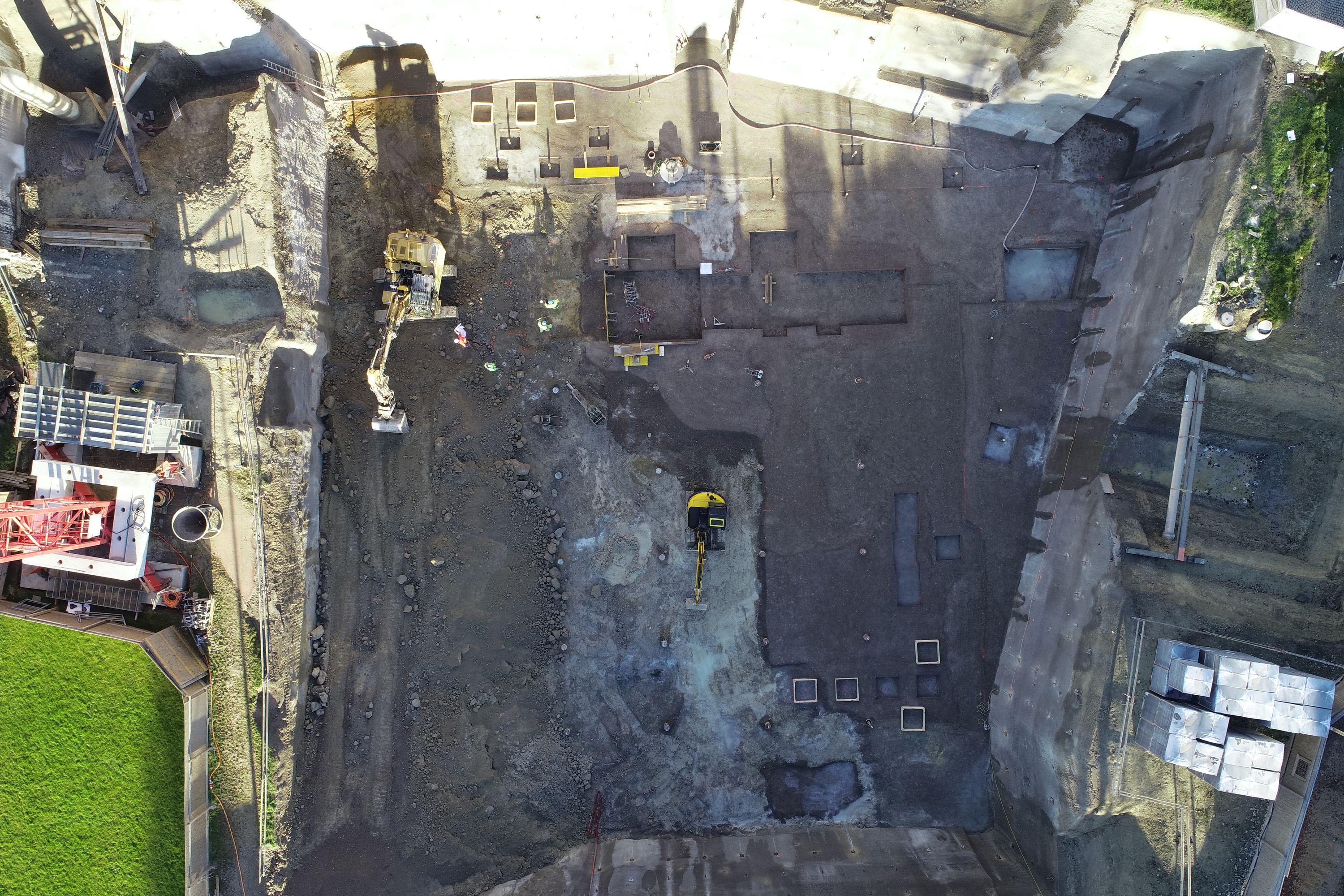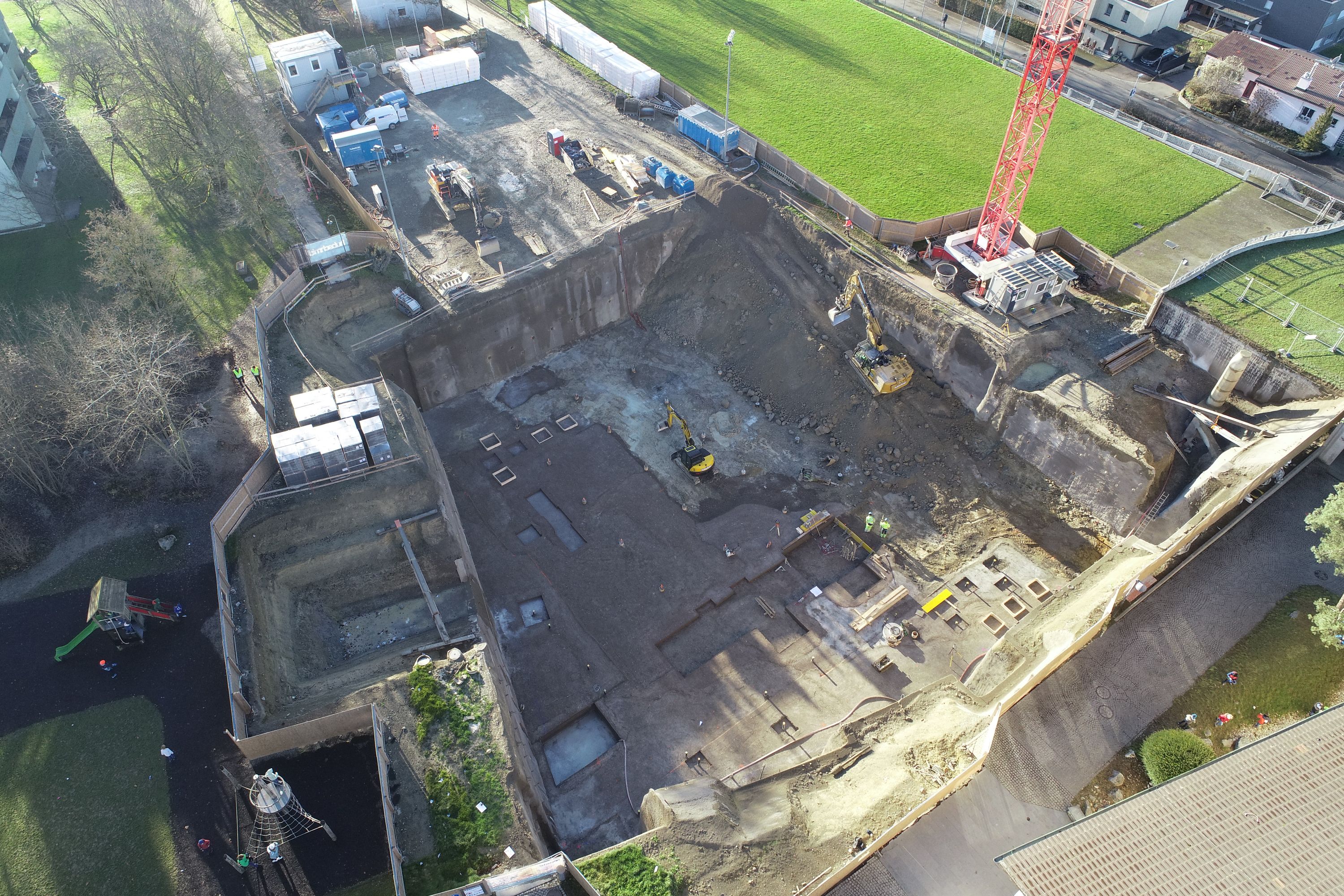 Im Auftrag der Gemeinde durfte die Straub Vermessungen AG die geodätische Überwachungen und Rissprotokolle der umliegenden Gebäuden und Strassen übernehmen. Zudem konnten wir mit der Drohne die Volumenberechnungen der ca. 10m tiefen Baugrube und baubegleitende Kontrollmessungen vom Rohbau ausführen.