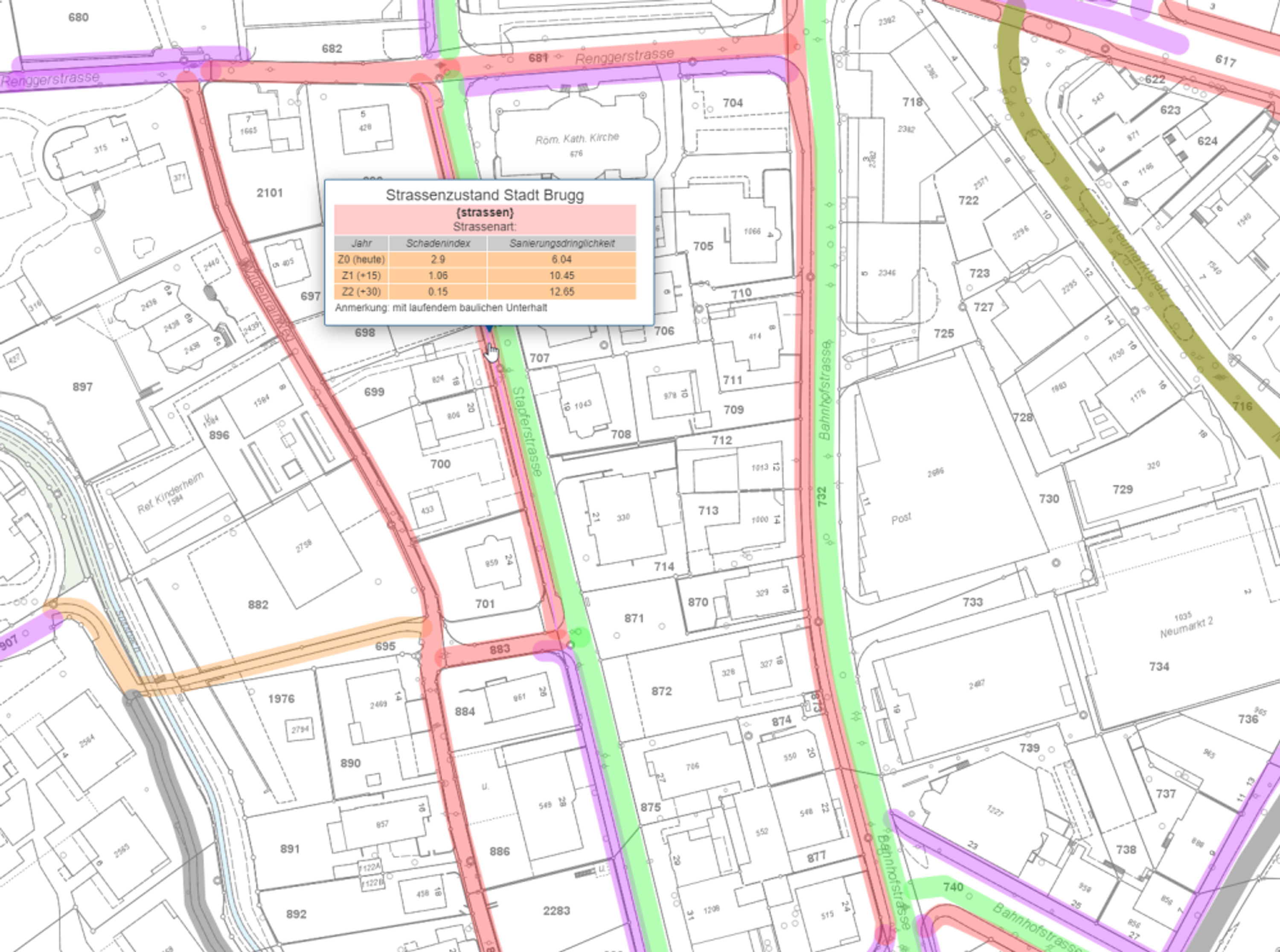 Brugg ist Zentrum des gleichnamigen Bezirks und ein bedeutender Industrie-, Gewerbe-, Dienstleistungs- und Schulstandort. Die Werterhaltung der Infrastrukturen Siedlungsentwässerung und Gemeindestrassen ist technisch und finanziell aufwendig. Zur Optimierung des Werterhaltungsprozesses ist in einer Zusammenarbeit mit Relis AG und IBB Energie AG die bewährte Methode der Zustandsmodellierung zum Einsatz gekommen. Diese wird in Brugg auch eingesetzt, um Szenarien über die zukünftige Entwicklung der Infrastruktur zu modellieren. Damit werden die mittelfristigen Prioritäten der Werterhaltung frühzeitig und nachvollziehbar festgesetzt.