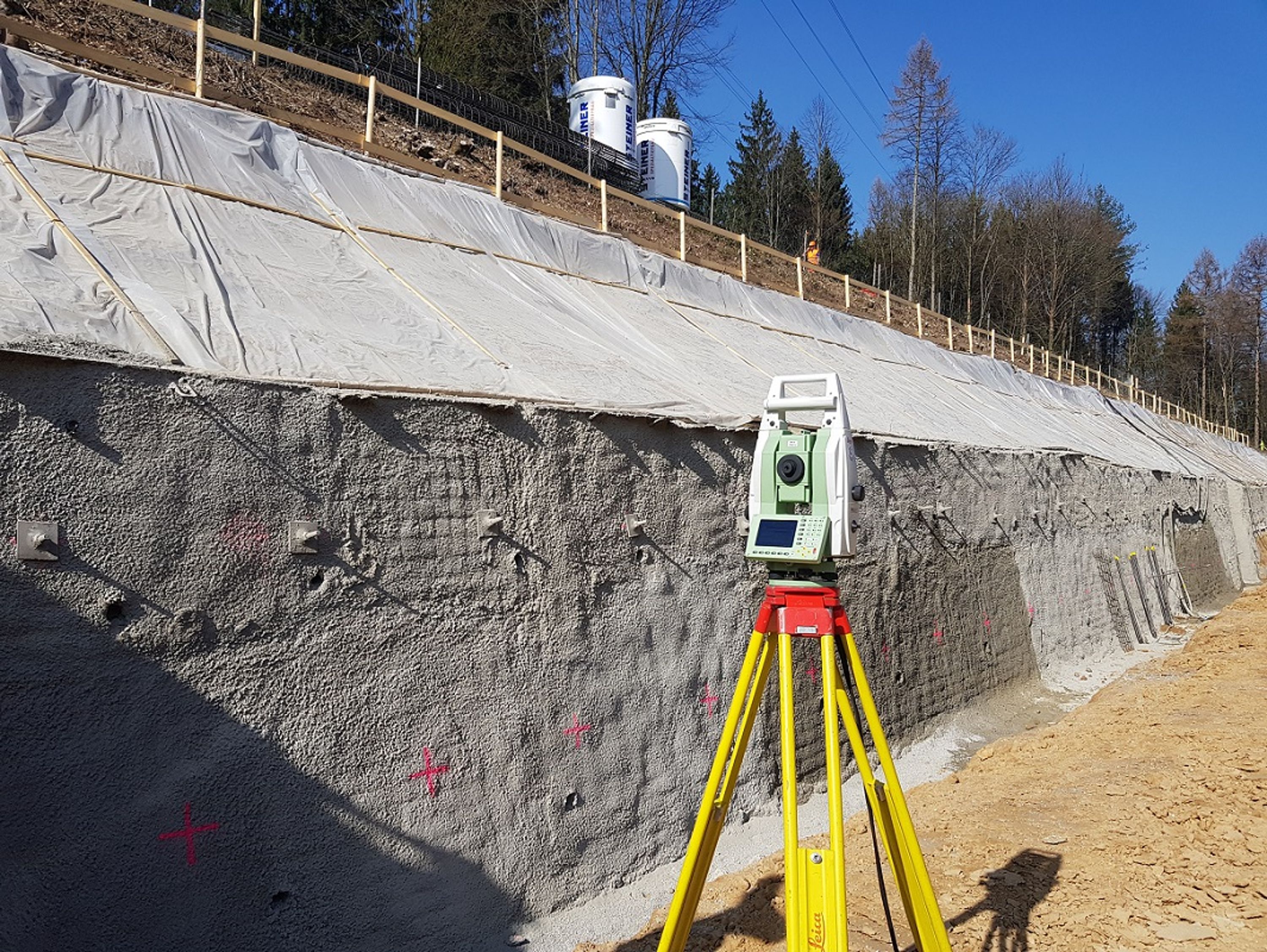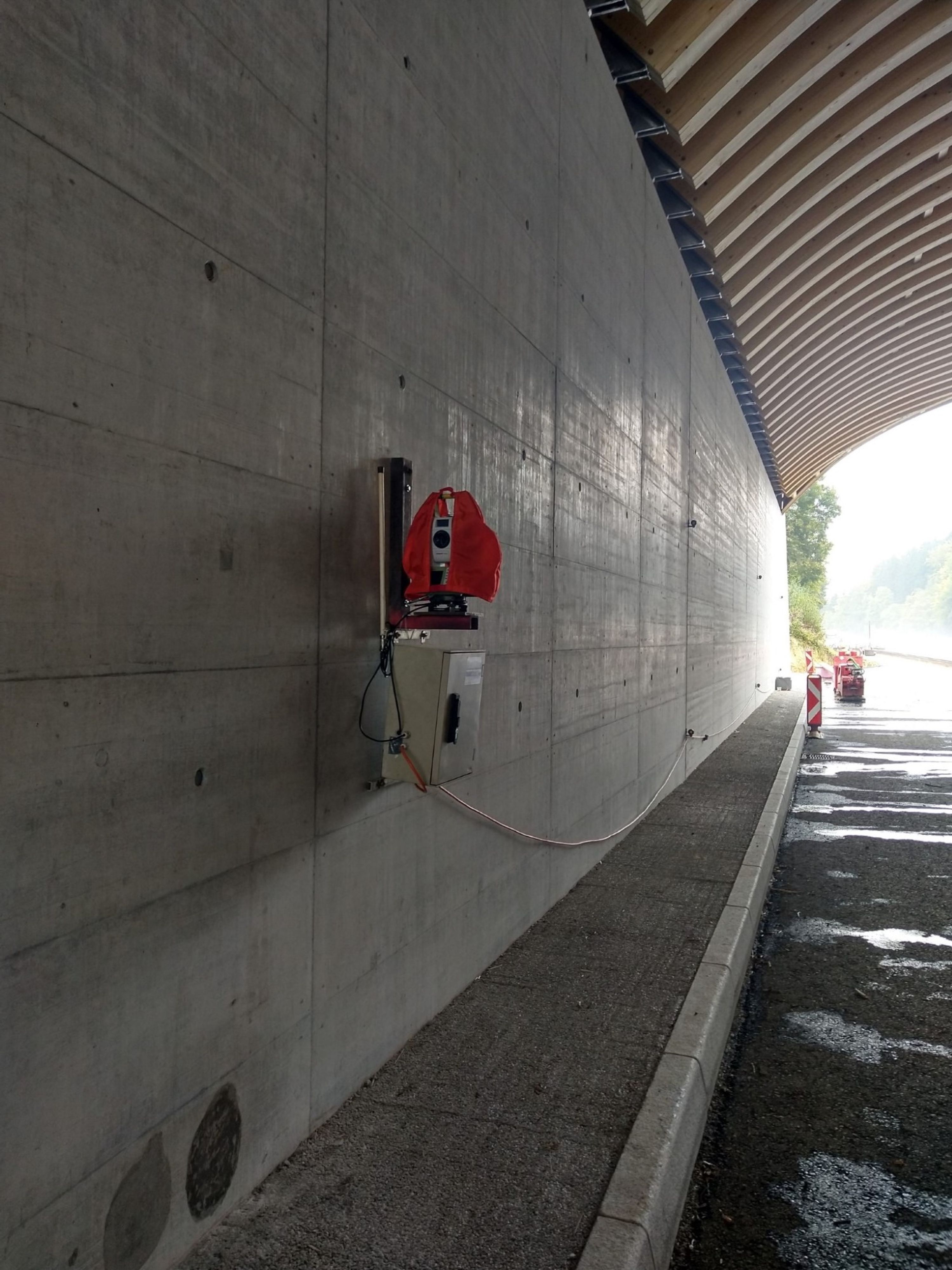 Während den Aushubarbeiten wurden die beidseitigen Spritzbetonwände in regelmässigen Intervallen manuell überwacht, ein automatisches Monitoring war aufgrund der beengeten Verhältnisse und der Dynamik der Bautätigkeiten an dieser Stelle nicht sinnvoll. Kurz vor dem Einbau der vorfabrizierten Holzdachkonstruktion wurden von uns sämtliche Ankerpunkte und die Bauwerksachsen nochmals abgesteckt und Kontrolliert. Dadurch konnte das passgenaue Einsetzen der Bauteile in den Teilsperrungen der A1 garantiert werden. Die Überwachung der neu erstellen Aussenwände und der Mittelwand erfolgte von jeweils einem fest installierten Tachymeter pro Fahrtrichtung und lieferte durchgängig aktuelle Ergebnisse für Verkippungen und Durchbiegungen während der Überschüttung.